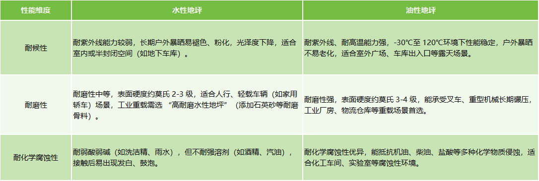结论:传统油性地坪在耐候、耐磨、耐化学腐蚀上更胜一筹,适合户外、工业重载、腐蚀性场景;水性地坪通过技术升级(如添加耐磨骨料、改性树脂),可满足轻载、室内场景的耐用需求,且环保优势足以弥补性能上的细微差距。